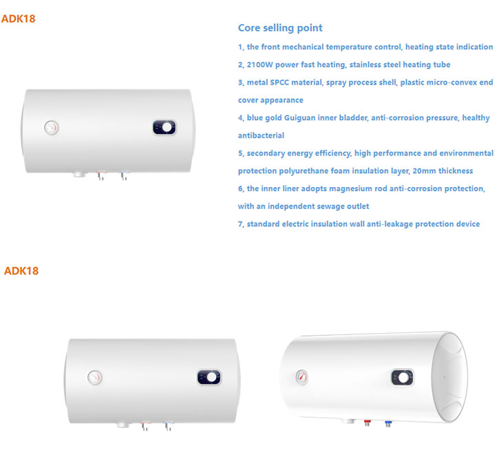 | Product function introduction | Basic configuration: enamel inner tank, front knob mechanical temperature control, water temperature indicator inner tank temperature, heating lamp indicator, 2200W single power, independent sewage outlet, built-in anti-electric wall; Protection against overpressure/overtemperature/dry burning. | ||||||||